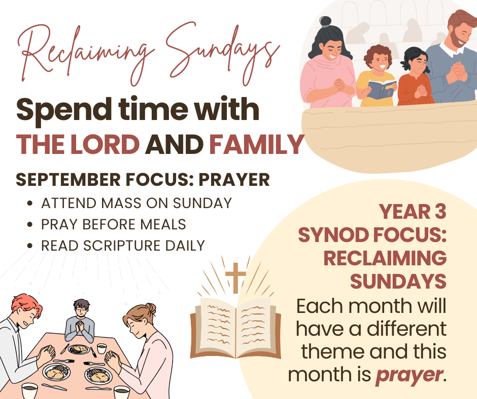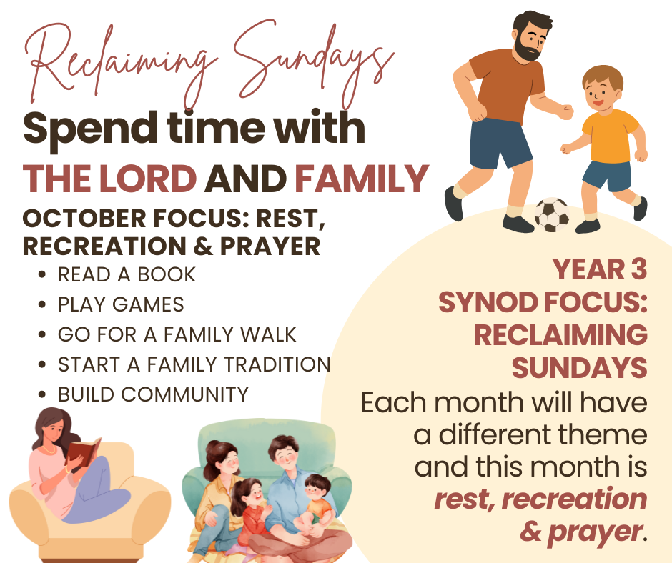 Synod Priority Year 3 will be on Parents as the Primary Educators. Each month there will be a different focus, each revolving around reclaiming the Lord's Day, while spending time with God, family, friends and community.